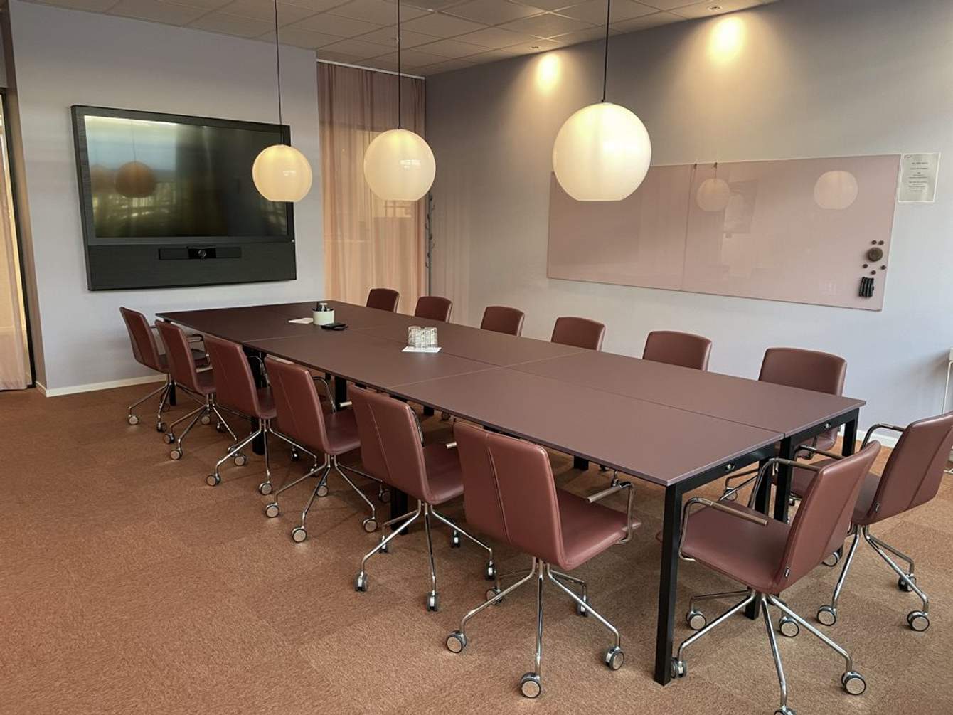 Större mötesrum med plats upp till 14 personer som passar perfekt till större möten eller konferens. Tv-skärm 73″ och videokamera samt stor whitebordtavla på vägg.